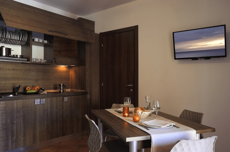 Gli appartamenti sono dotati di cucina con angolo cottura, bagno con doccia e spazio esterno privato. Tutti gli appartamenti della struttura sono dotati di cucina con angolo cottura ad induzione, forno a microonde, TV da 32” con canali satellitari nazionali ed esteri (una in ogni stanza), bagno con doccia con maxi soffione, asciugacapelli, cassaforte e connessione internet (cavo ethernet necessario). Tutti gli appartamenti hanno un affaccio esterno, sia che si tratti di un ampio balcone ai piani superiori, sia di una loggia al piano terra di fronte allo splendido giardino con fiori e piante mediterranei.