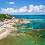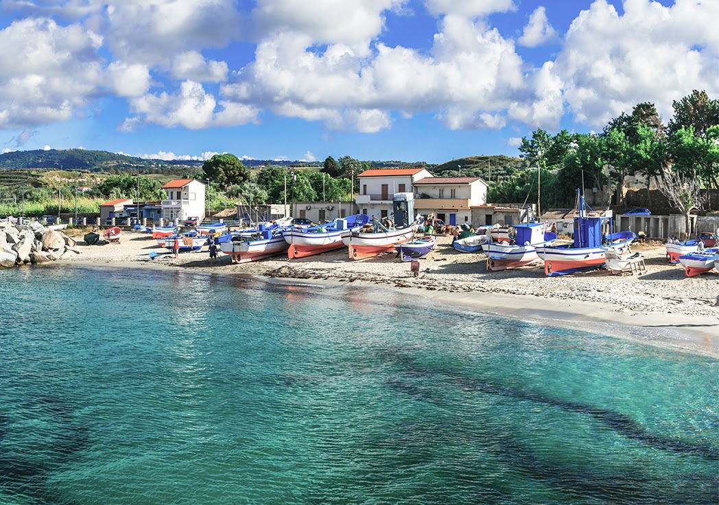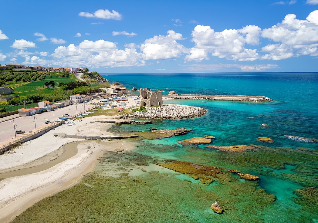 - Fishing italian village Briatico in Calabria with turquoise sea and old saracen tower. Drone Panorama – Italy